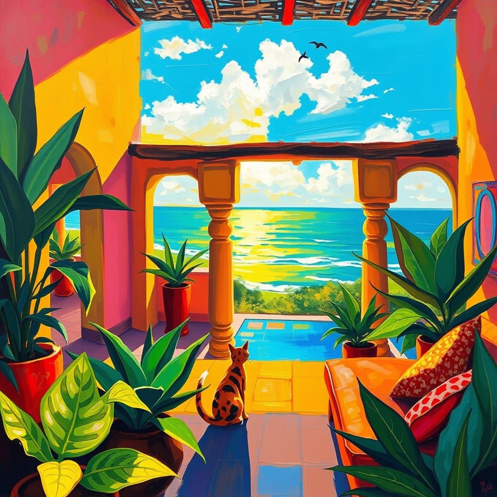 A vibrant villa interior featuring a cat, exotic plants, and ocean view. The image is an abstract, modern oil painting with broad brushstrokes and neon accents.