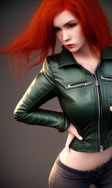 This image depicts a red-haired woman with green eyes wearing a leather jacket. The figure is rendered in a hyperdetailed style as 3D digital art.