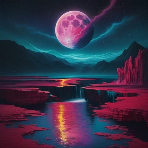 A striking picture of floating islands linked by energy bridges, with teal waterfalls cascading down. This vibrant oil painting features a starry night sky and a glowing moon in a surreal aesthetic.