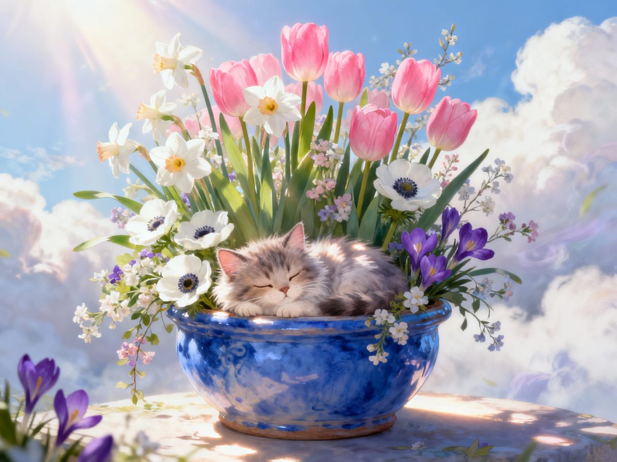 This image shows a fluffy kitten sleeping peacefully in a blue ceramic pot filled with vibrant spring flowers. Beams of divine sunlight create a serene, ethereal atmosphere.
