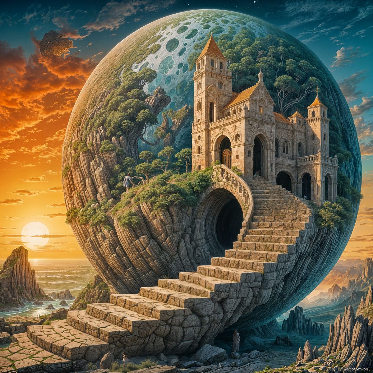 This image depicts a surreal realm within a split Earth globe, featuring a Hispanic woman walking a cobbled path towards a setting sun, in the style of early 20th-century Surrealism with intricate lithograph patterns.