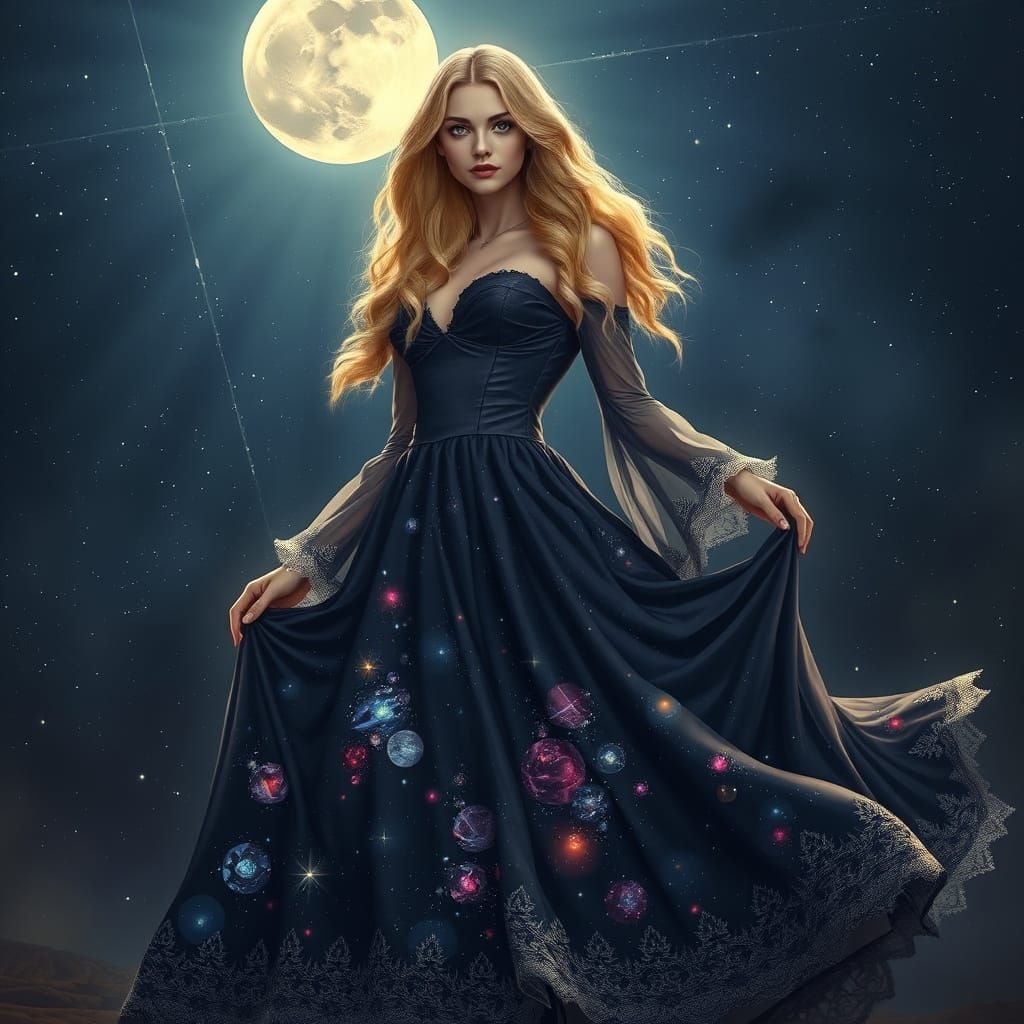 A woman with long blonde wavy hair, wearing a elegant dress, the bodice, the long flowing skirt having the clusters of galaxies all over it , with lace trimming the edge of the skirt, long flowing sleeves and lace trimming the edging, background of the night sky with the moon beaming down on her
