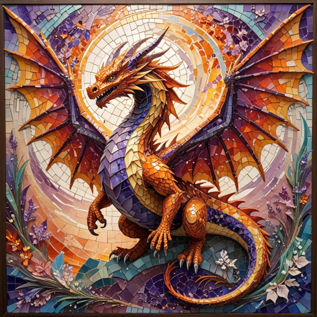 This image features a majestic dragon in flight, rendered in an anime watercolor mosaic style with intricate ceramic tile details. Golden hour light enhances the vibrant orange and purple hues.
