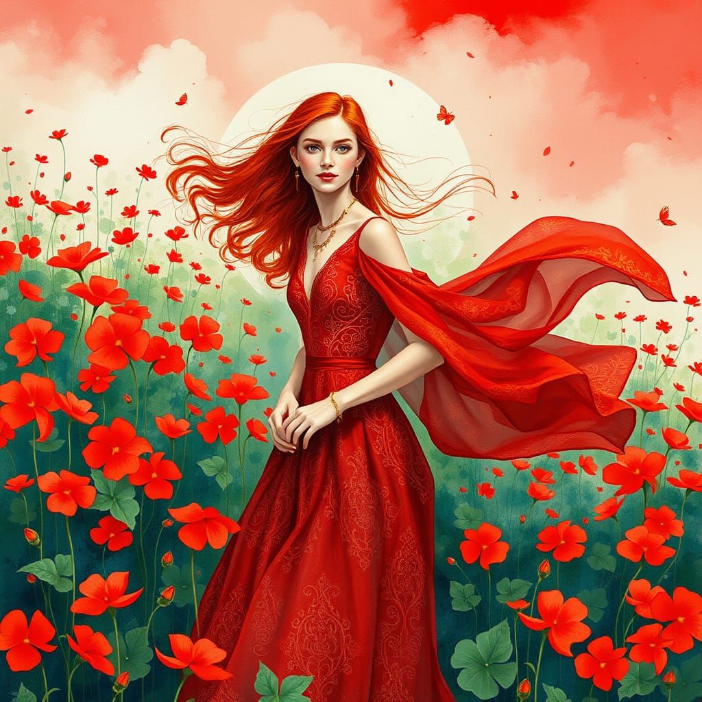 This image shows a young woman amidst a whimsical field of red clovers, wearing an elegant red and gold dress with delicate gold jewelry, evoking dreamy, expressive styles and captivating, ethereal qualities.