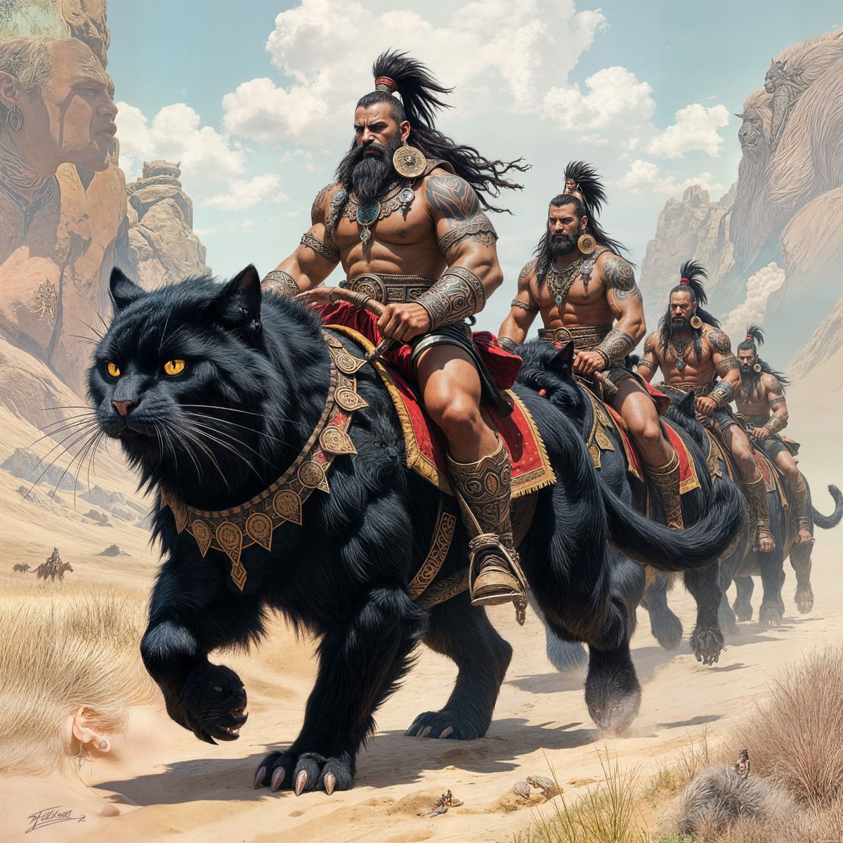 This image shows heavily tattooed troll warriors in leather armor riding large black cats. The image has a gritty and dynamic aesthetic, reminiscent of fantasy art with futuristic elements.