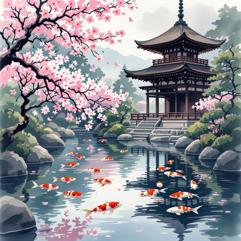 A tranquil koi pond reflects a Japanese temple, petals drifting on the water. The dark wood temple features intricate carvings and a pagoda roof, set amid lush greenery. The image evokes traditional Japanese woodblock prints in a minimalist aesthetic.
