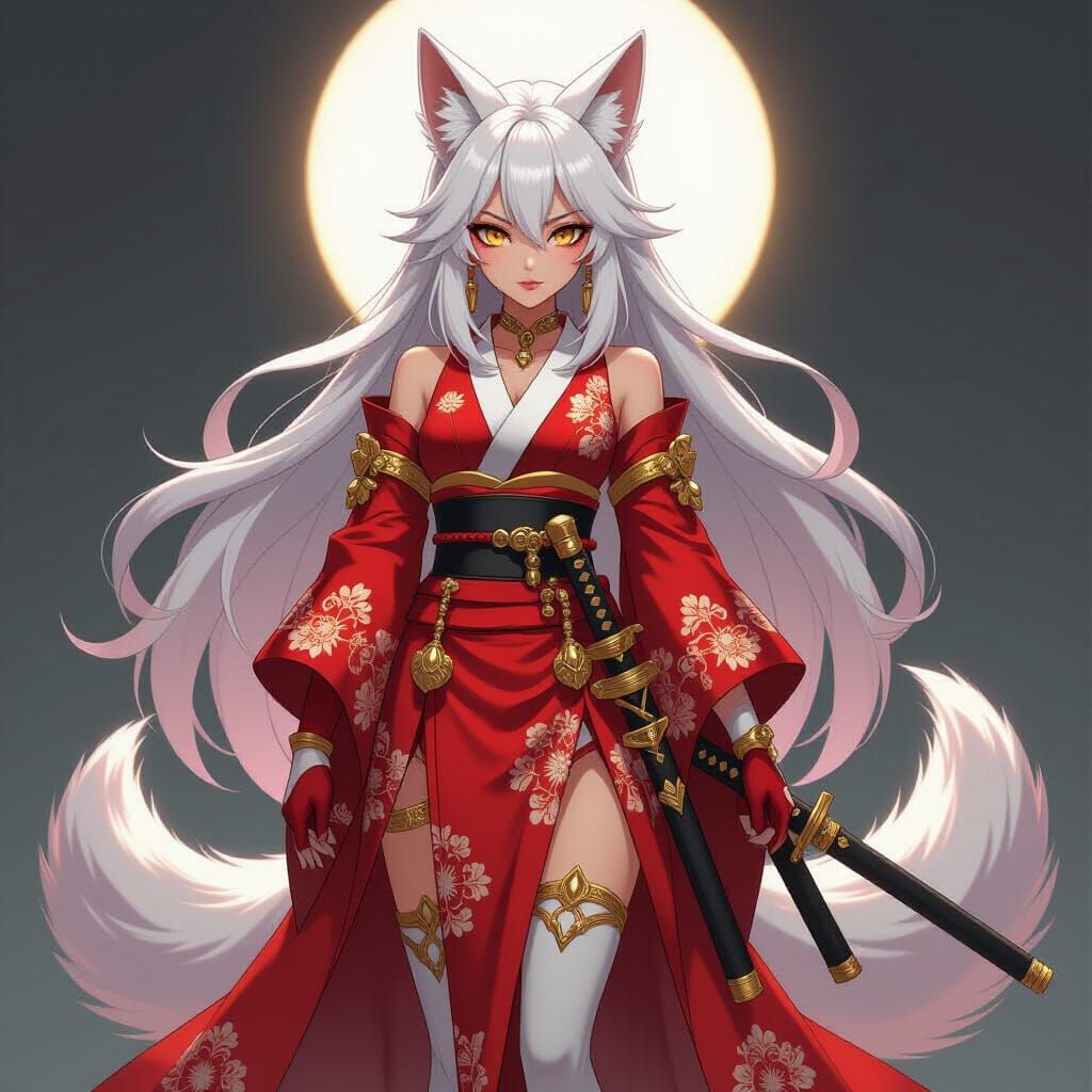 This image showcases a confident anime female admiral with white hair, kitsune ears, and tails. She wears a detailed red kimono and holds a katana, presented in a dramatic, vibrant anime art style.