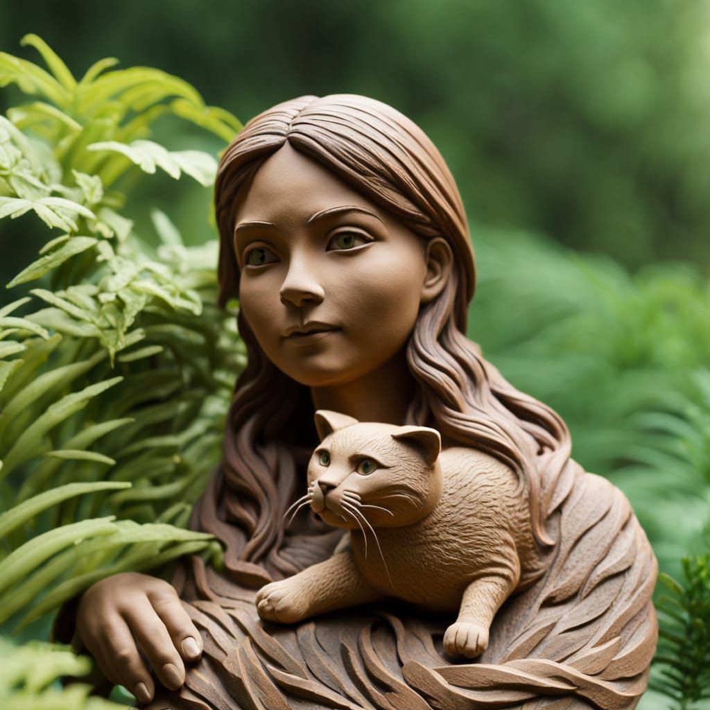 This image shows a realistic clay sculpture of a woman holding a cat. The figures are carved from clay and set against a forest background, also crafted from green clay.