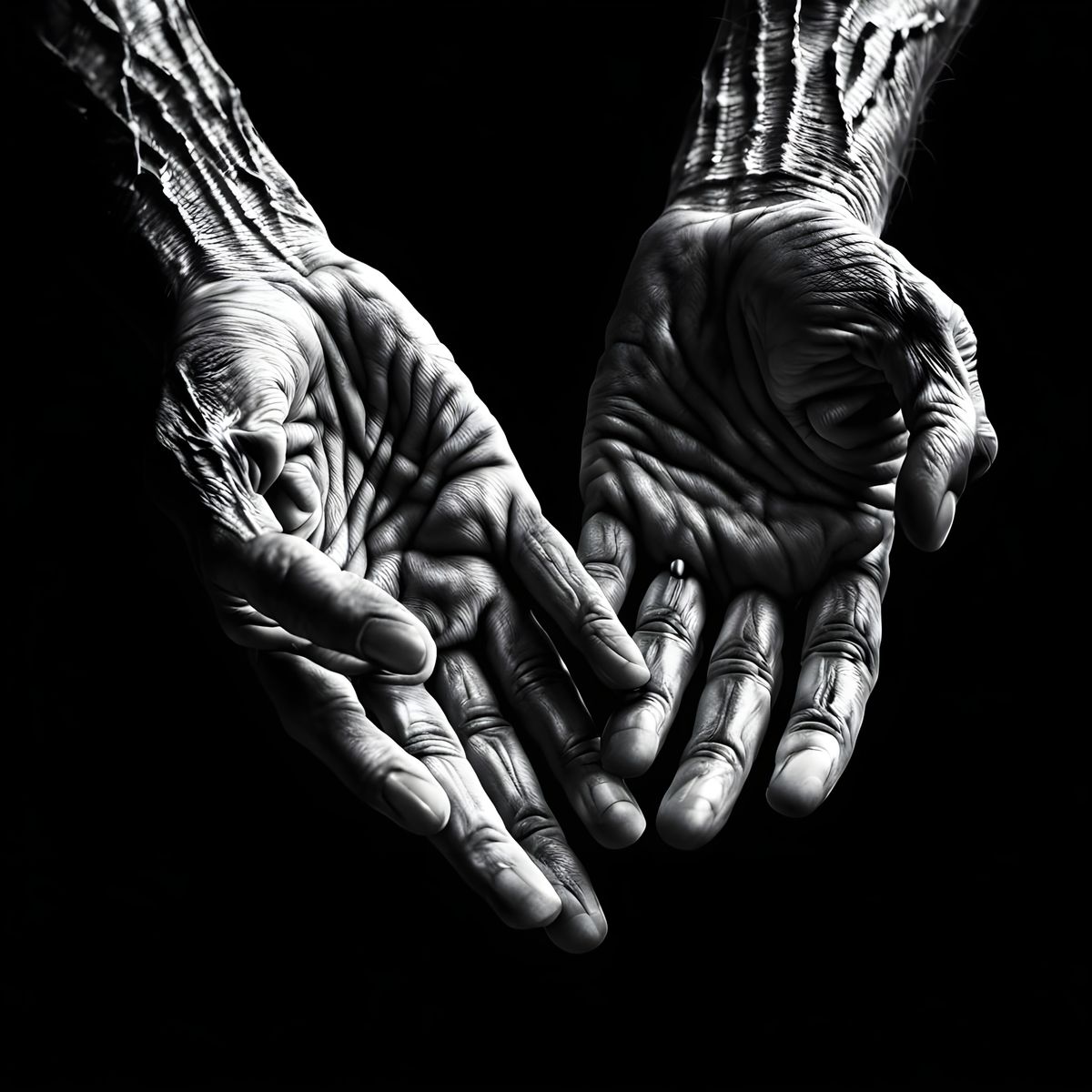 This image showcases hands in high contrast black and white, reminiscent of Norman Lindsay's style, with intricate details and textures, set against a dramatic lightning background.