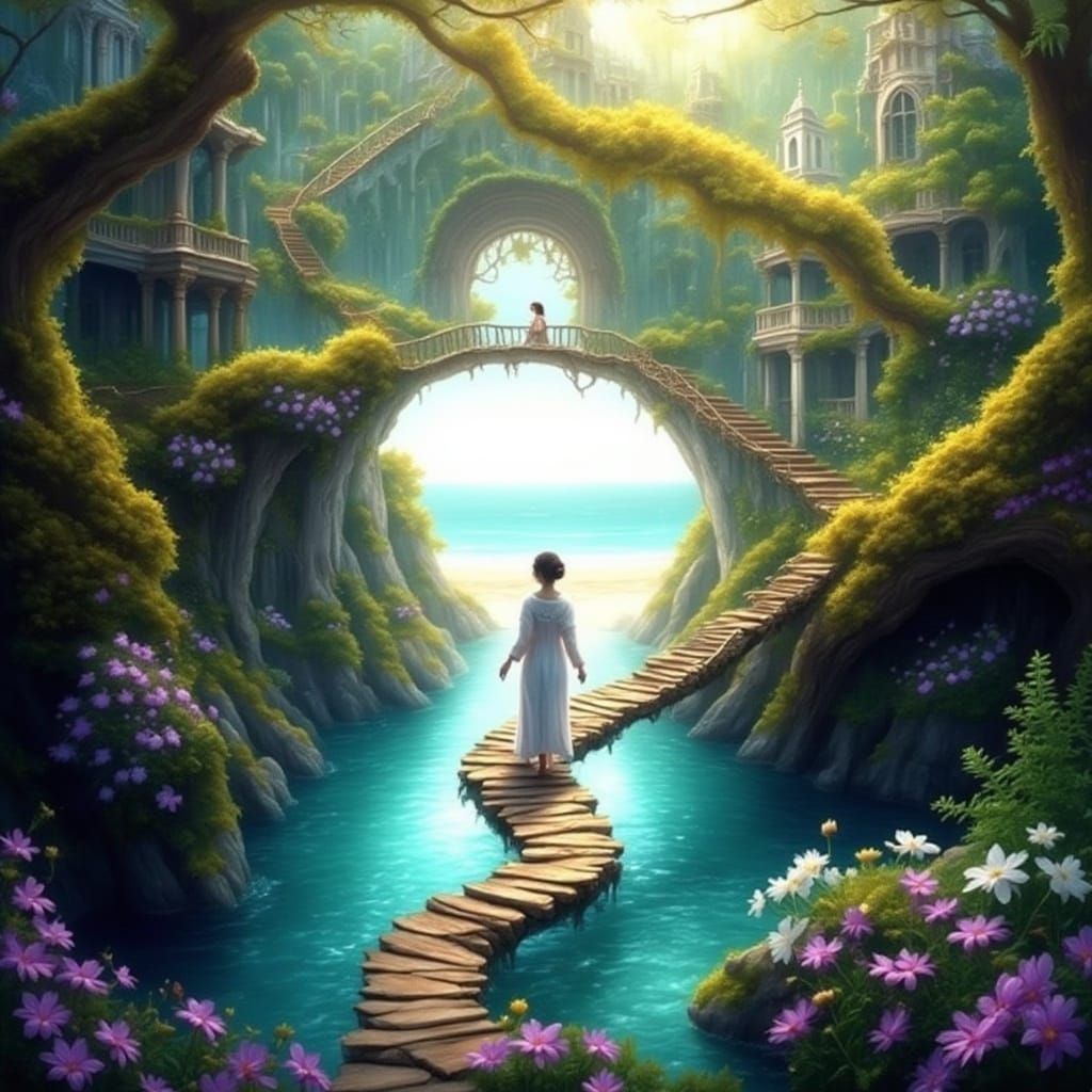 A serene and enchanting scene of a woman walking through a mystical forest, towards a stunning, lightblue wooden mansion on a sandy beach, surrounded by vibrant wildflowers and crystal clear water, evoking a sense of whimsy and wonder.