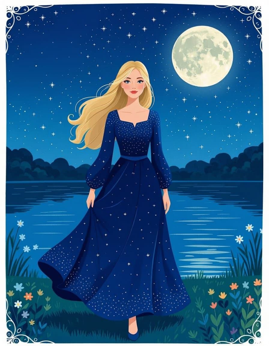A luminous fairy-tale illustration of a blonde woman in a starry blue dress by a calm lake at night under a large full moon. Realistic face, digital art style with soft gradients and gentle glow.
