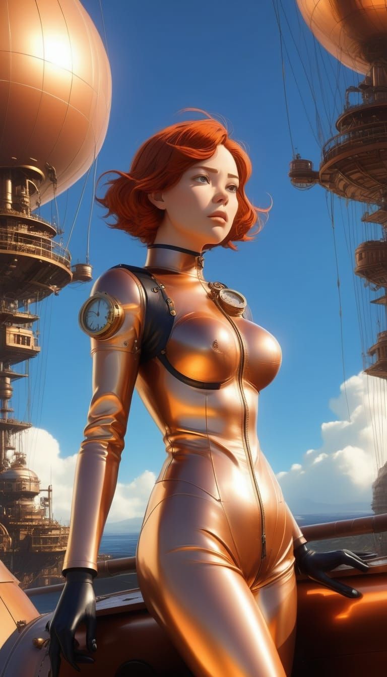 This image shows a red-haired woman heroically posed on the deck of an elaborate airship. The steampunk illustration features clockwork mechanisms and sails, with dynamic lighting in warm, golden hues.