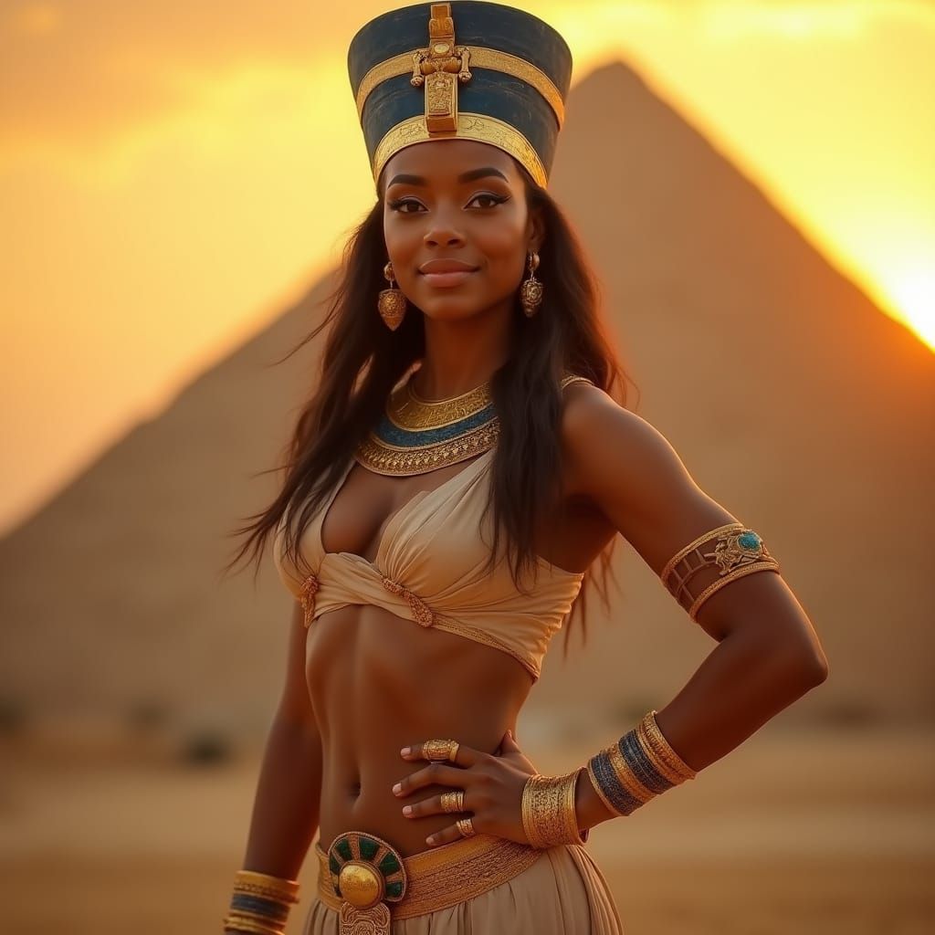 A stunning ancient Egyptian queen stands confidently in front of a majestic pyramid, bathed in warm golden light, with bold kohl eyeliner and ornate gold jewelry, showcasing timeless beauty in a photorealistic style with deep focus and vibrant colors.