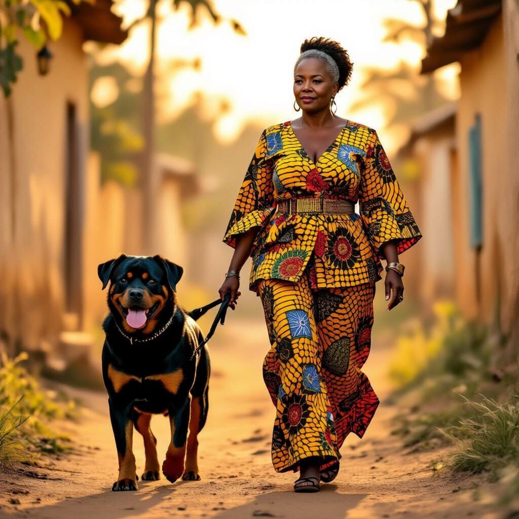 This image shows a middle-aged African woman in colorful traditional clothing walking with her Rottweiler. The scene is reminiscent of cinematic storytelling with a warm, sun-kissed aesthetic and rich film grain.
