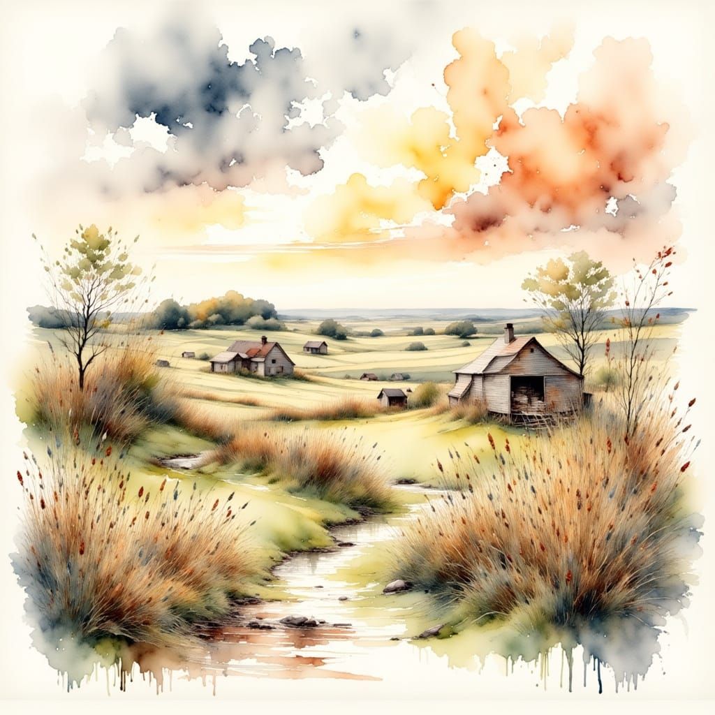 This image shows a serene rural landscape rendered as an ink and watercolor painting. The artwork evokes a sense of rustic charm with delicate lines and soft washes of color.
