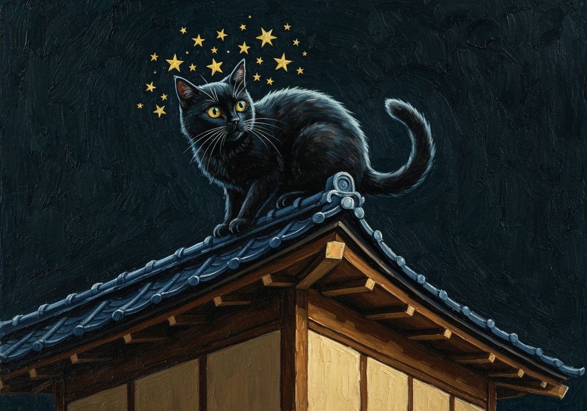 This image shows a black cat on a Japanese roof at night. The style is reminiscent of vintage oil paintings with thick, impasto brushstrokes, creating a dreamy and surreal mood.