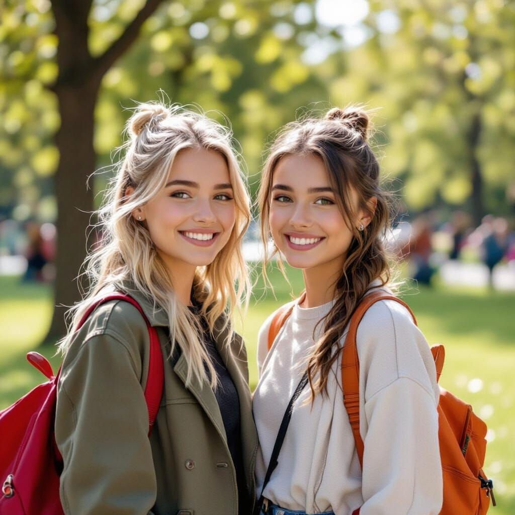 This image shows two smiling blonde girls in a park. One has a ponytail and a red bag, the other has a bob and an orange backpack, rendered in a bright, illustrative style.