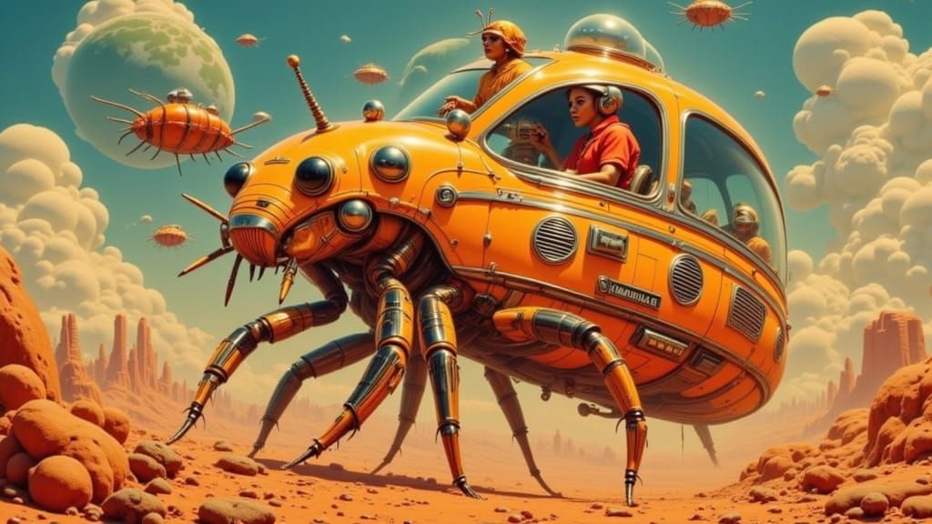 Create your own vintage-futuristic insect vehicles with our free AI image generator. It's fun and easy!