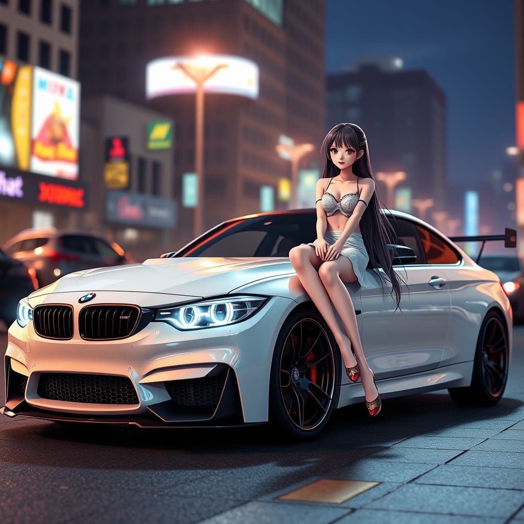 A digital rendering shows an anime girl with long hair sitting on the hood of a white BMW M3 GTR in a city at night. The image is brightly colored with a radial gradient background.