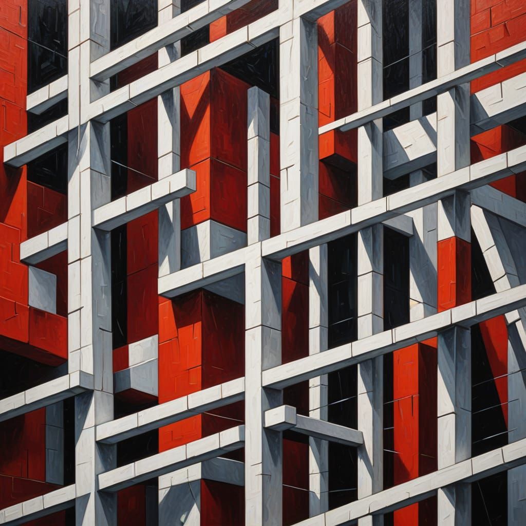 This image shows a close-up of an abstract cubist scene. A red castle wall is encircled by white metal rods, rendered in a geometric style with sharp, interlocking cubes and vibrant hues.