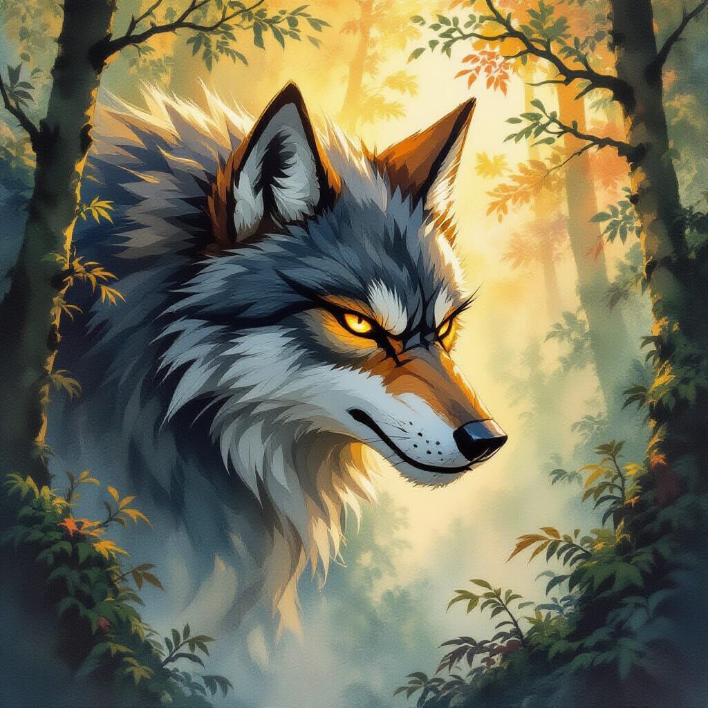 This image shows a watercolor painting of Shishigami, a wolf god, in a misty forest. The artwork is rich with vibrant colors and bathed in warm golden light, creating a serene and mystical atmosphere.