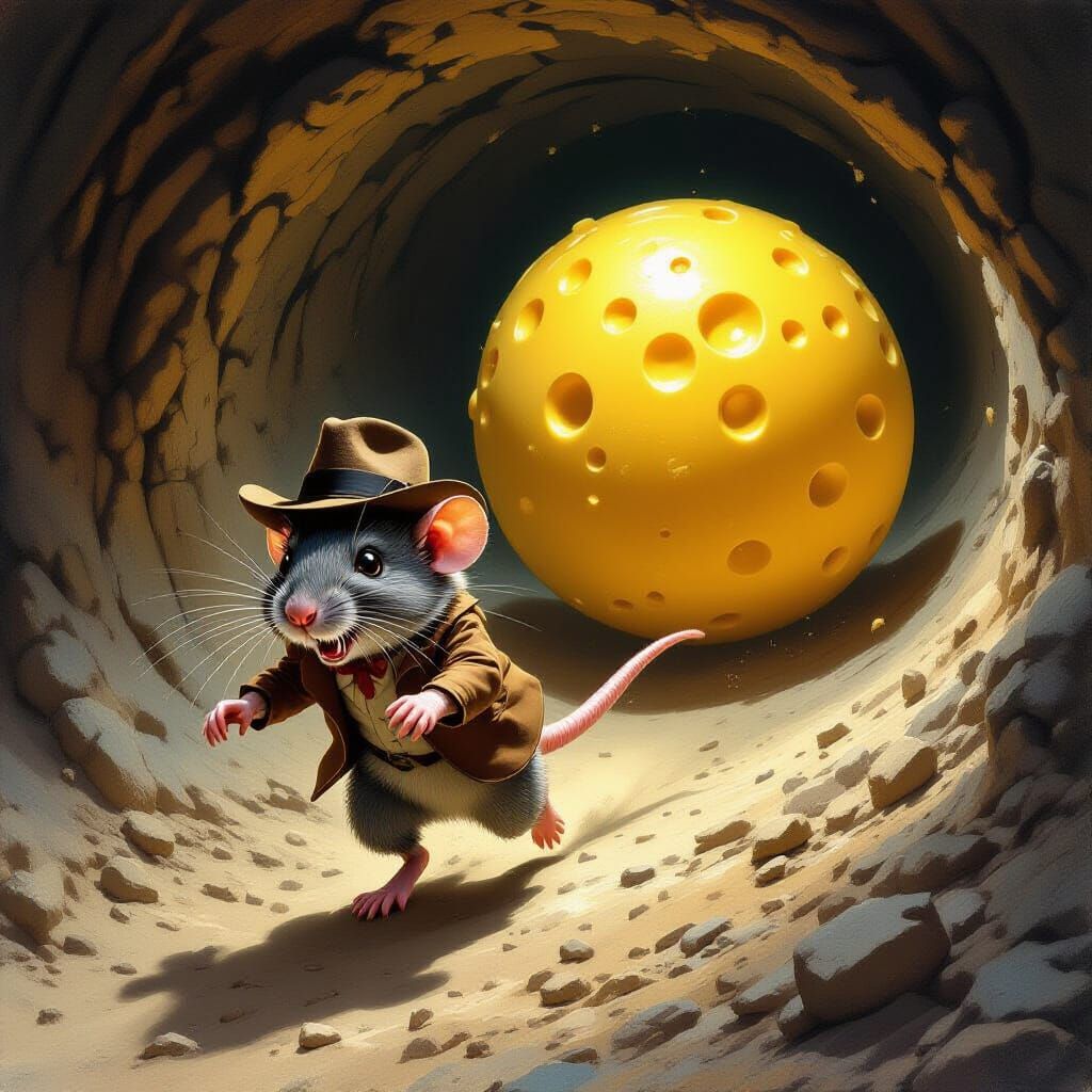 A timid mouse dressed as Indiana Jones flees through a dark tunnel, chased by a giant cheese ball. Cinematic lighting and rich textures create a dramatic, Spielberg-esque adventure scene.