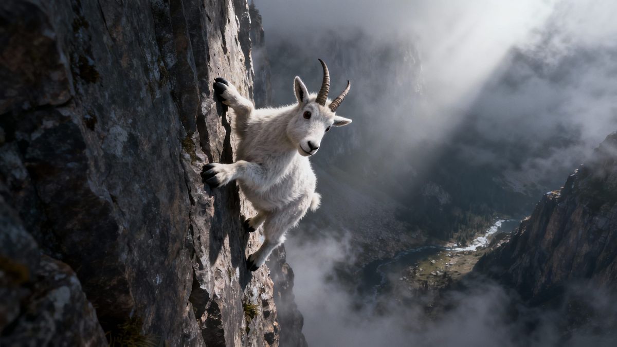 This image shows a cute Rocky Mountain Goat desperately clinging to a sheer cliff edge. Moody, grainy, and noisy atmosphere with dynamic lighting piercing fog.