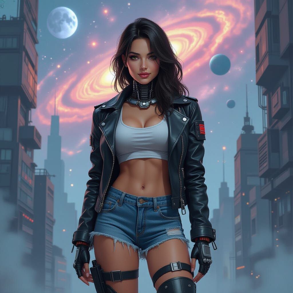 This image shows a female robot in a hi-tech city. She is wearing jeans shorts, a tank top, and a worn leather jacket, set against a spiritual cosmos backdrop. The artwork is in a sensual pin-up style.