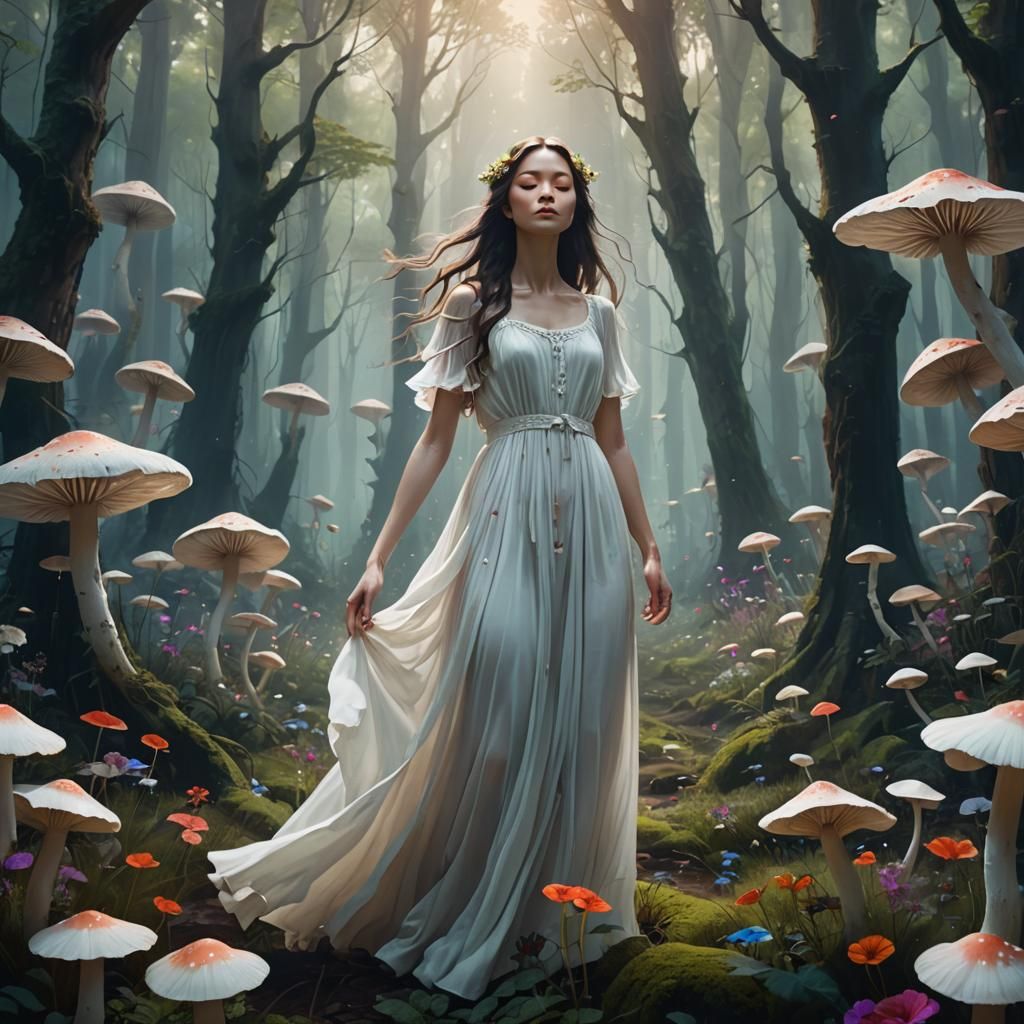 A surreal fantasy image of a woman in a white dress in a dreamlike forest. The scene features vibrant mushrooms, soft mist, and warm light, with a dark entity dissolving in the background. Rendered with intricate detail.