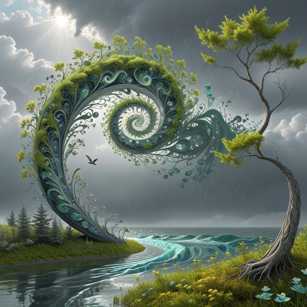 Pleasant curves, abstract unique spiral curves, abstract vector fractal, sine wave function, Mandelbrot, delicate 3D shading, Zentangle, wavy psychedelic, vivid color. Light rain from morning blue sky with grey clouds, scattered rays of sunshine, flowery green cypress swamp, lakeside horizon, birds roosting. wavy curvy abstract.