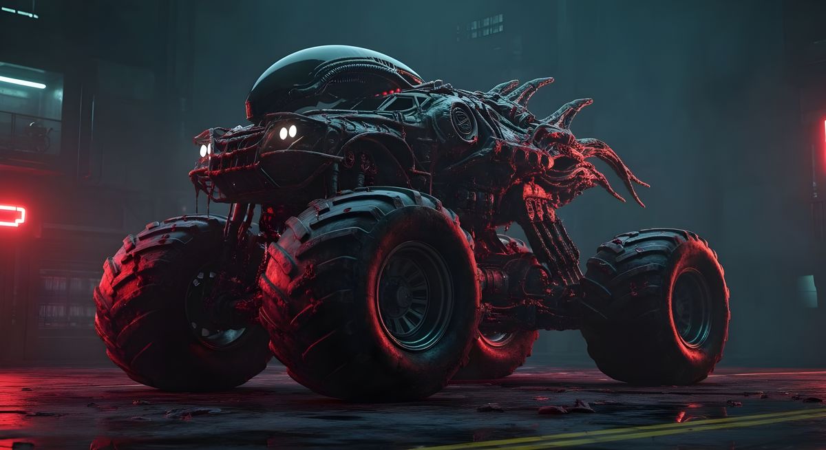 This image shows an ultra-detailed, photorealistic alien war machine with monster truck wheels. The design features dynamic lighting, volumetric shading, and a cyberpunk aesthetic with neon accents. Red and black slime add an ominous touch.