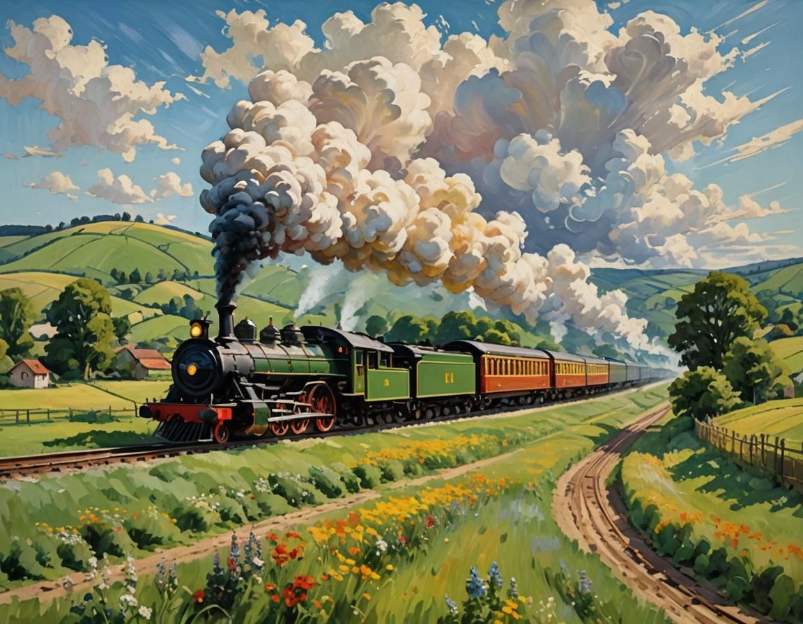 This image shows a steam train traveling through a sunny, rural landscape. The style evokes impressionist paintings, with thick brushstrokes and vibrant colors depicting the idyllic countryside.