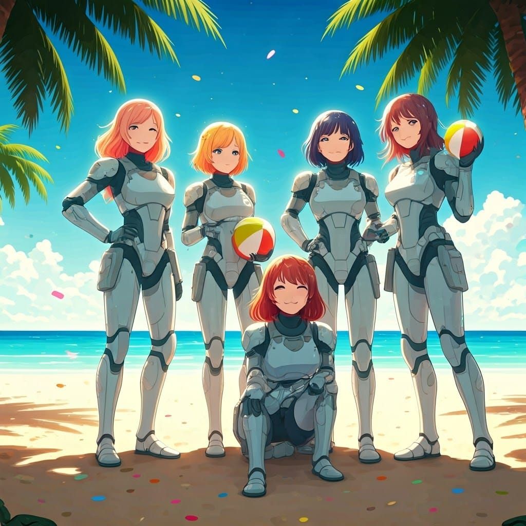 This image shows a lively beach party scene featuring a group of female rebel troopers in bold, flat manga style, surrounded by palm trees, beach balls, and confetti, with a radiant sun shining down on them.