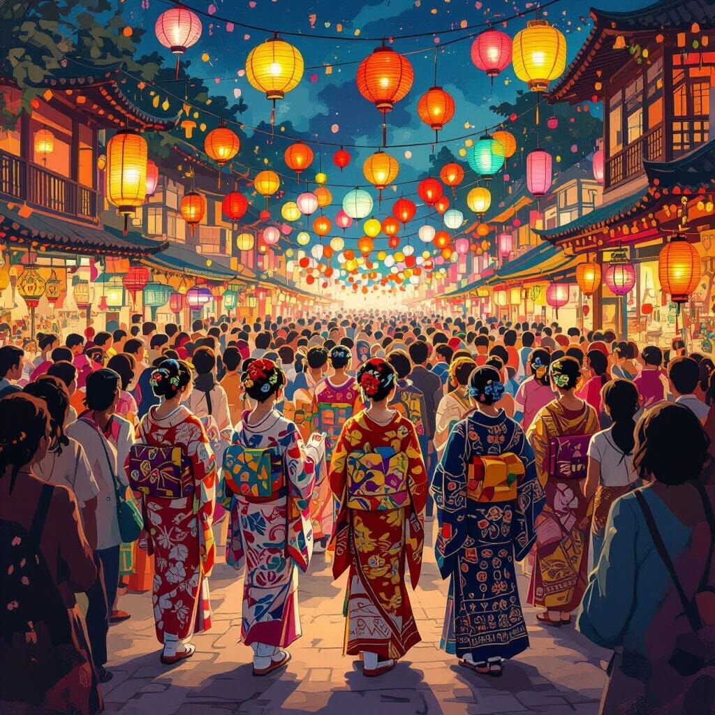 A vibrant festival scene with people in blended traditional clothing, surrounded by colorful lanterns and eclectic music. The image has a dynamic, whimsical, and lively aesthetic.