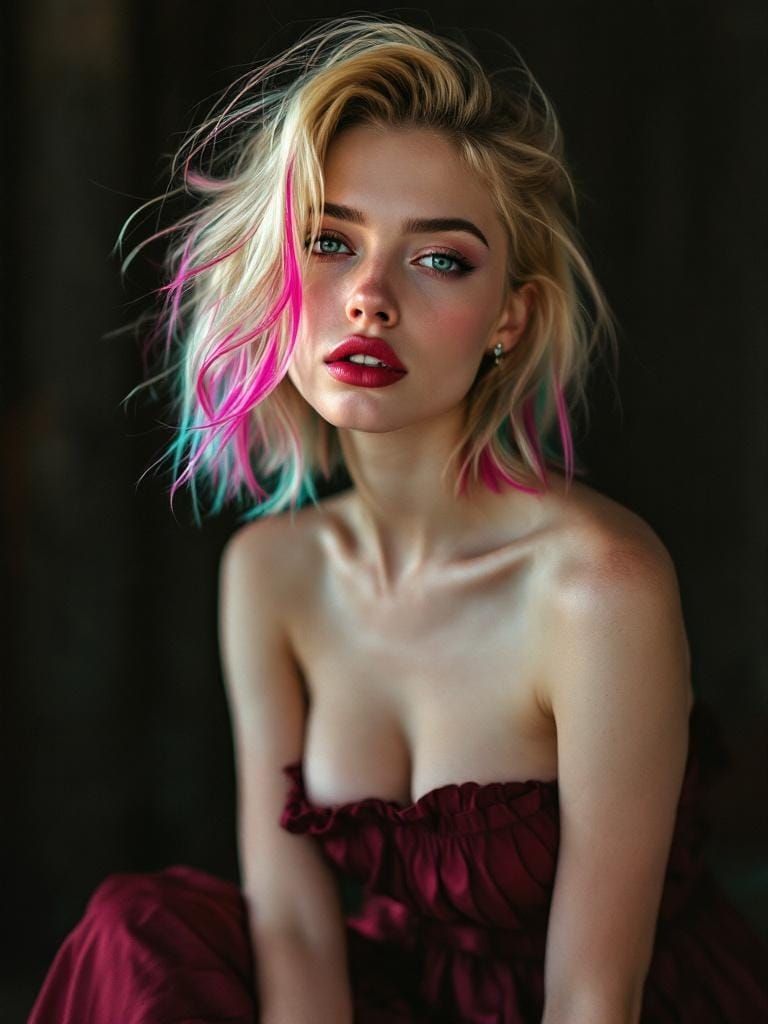 A striking picture of a blonde woman with pink and teal hair. The full-body portrait in Soviet Constructivism style features bold graphic elements and harsh photography.