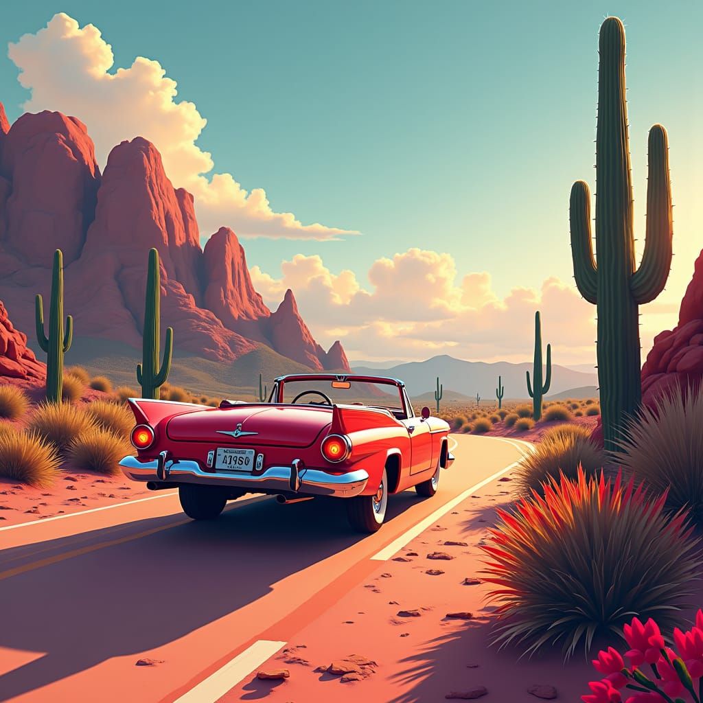 A vintage convertible cruises through an Arizona desert filled with wildflowers, leaving a trail of musical notes. This digital artwork evokes a dreamlike atmosphere with a low-poly aesthetic.