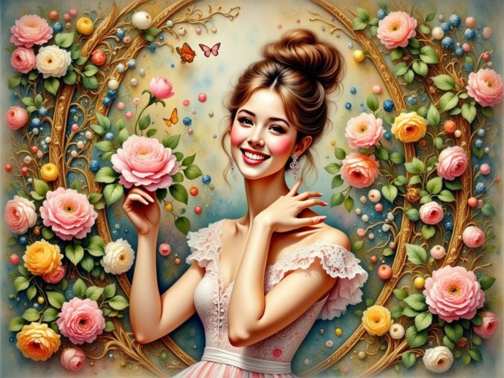 vibrante retrato art nouveau de uma mulher sorridente sentada em um jardim exuberante, com detalhes complexos e pinceladas expressivas que lembram o estilo de Alphonso Mucha. <lora:Lovely Touch:1.0> <lora:Impressionnism:1.0> Impressionnism Watercolor Impressionnism Impressionnism