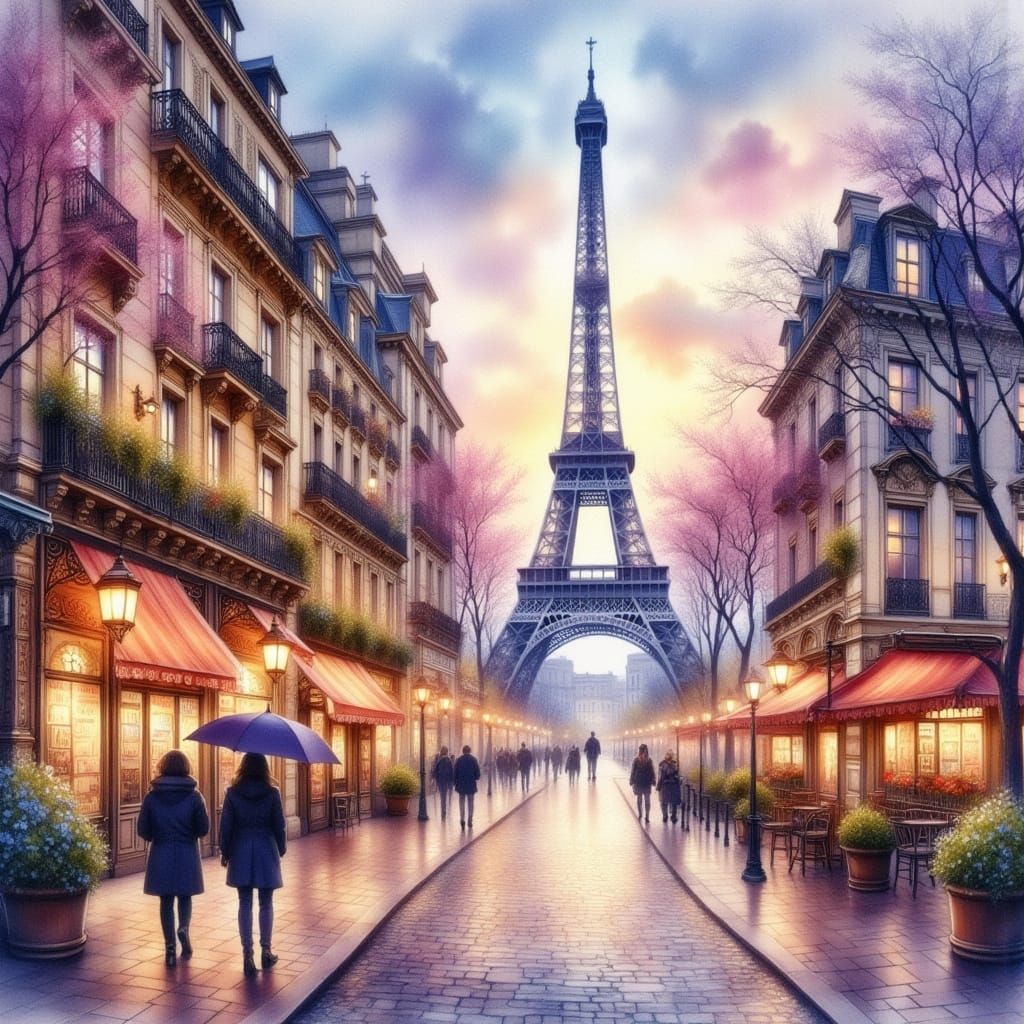 A watercolor painting of the Eiffel Tower in Paris at dusk. The wet street reflects the buildings and sky with gold, pink, and violet hues. Silhouetted figures with colorful umbrellas stroll by Haussmannian buildings.