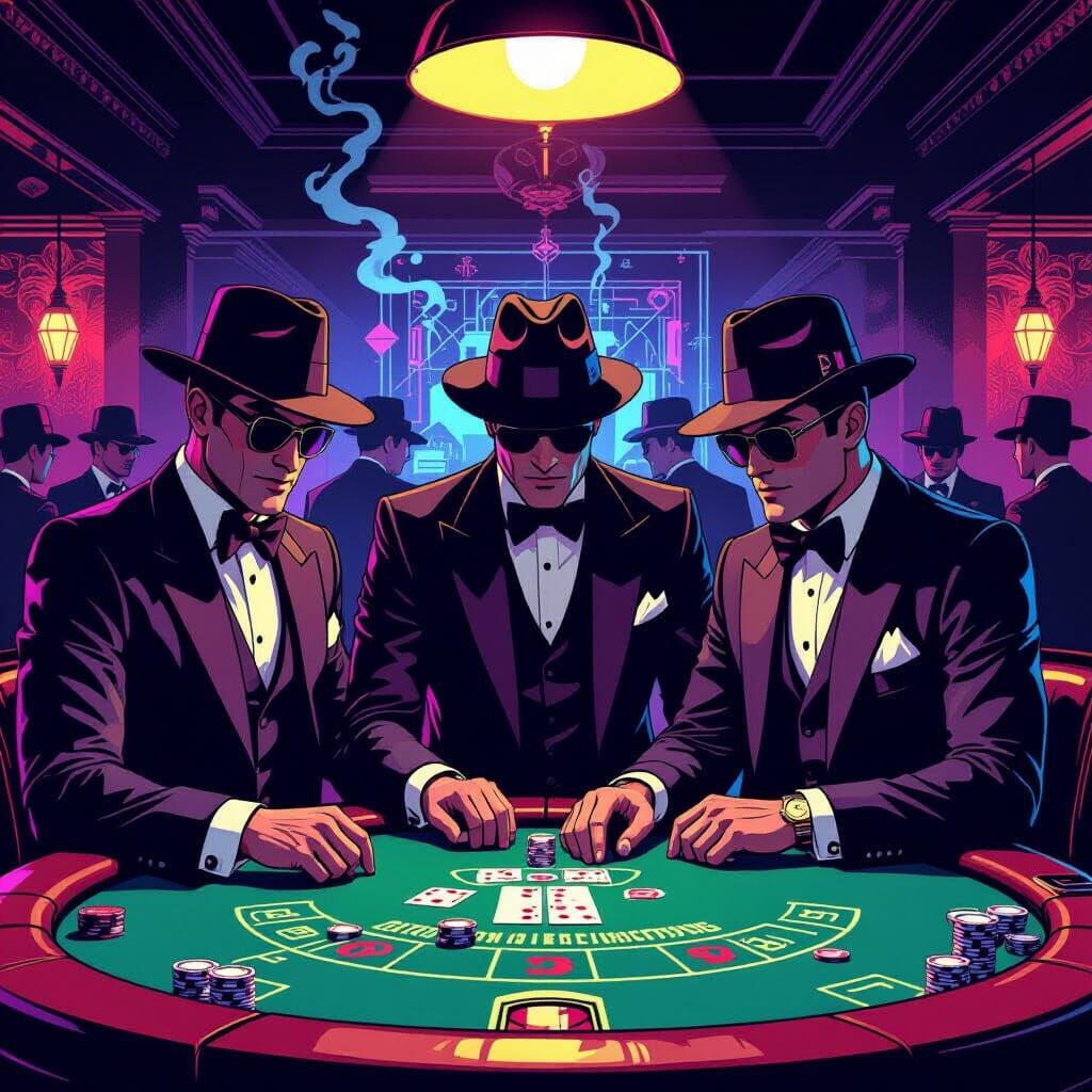 A striking picture of confident gangsters in tailored suits around a craps table. The scene is set in a smoky, neon-lit speakeasy, rendered with bold lines and vibrant colors, in a comic book art style.