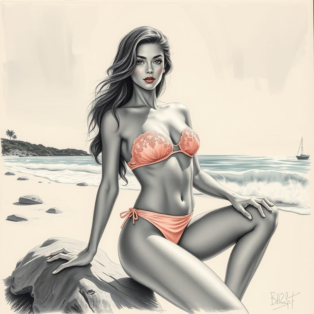 This image shows a 21-year-old woman in a pink lace bikini posing on a beach. The hyperdetailed drawing uses high contrast and expressive shading in an art nouveau style.