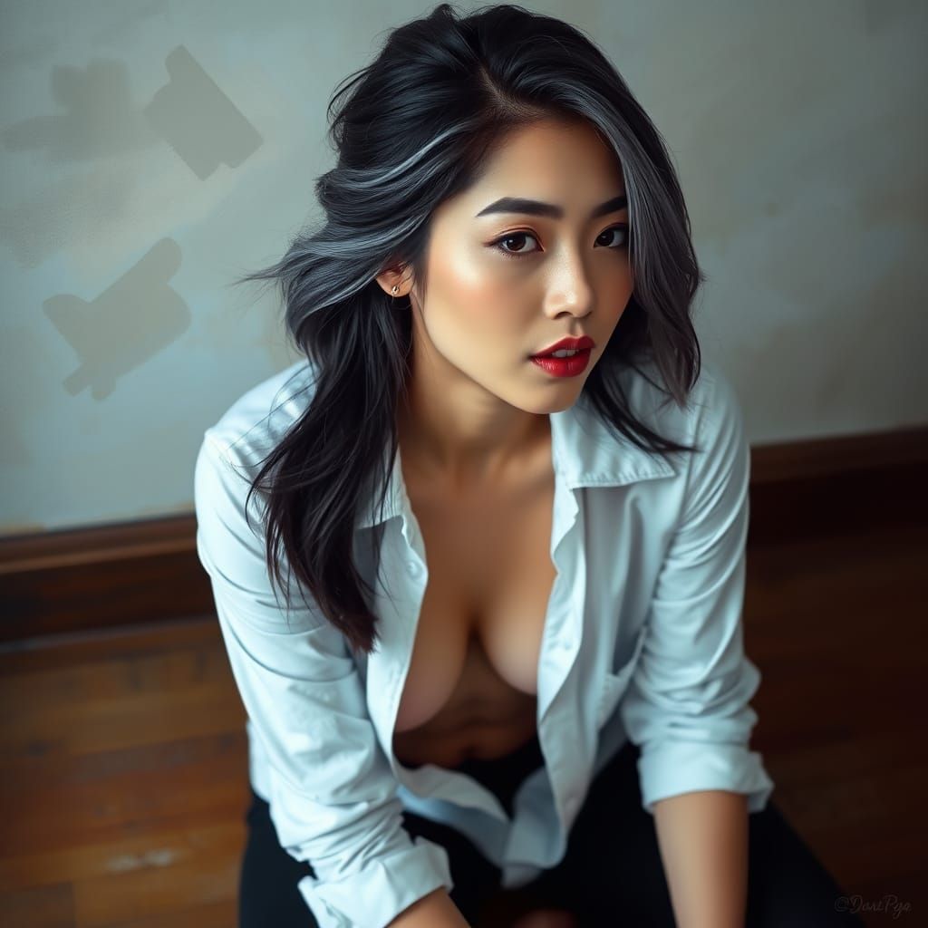 This image shows a beautiful Korean woman with striking makeup, seated and wearing a man's shirt. The style blends hyperrealism with a soft, painterly aesthetic.