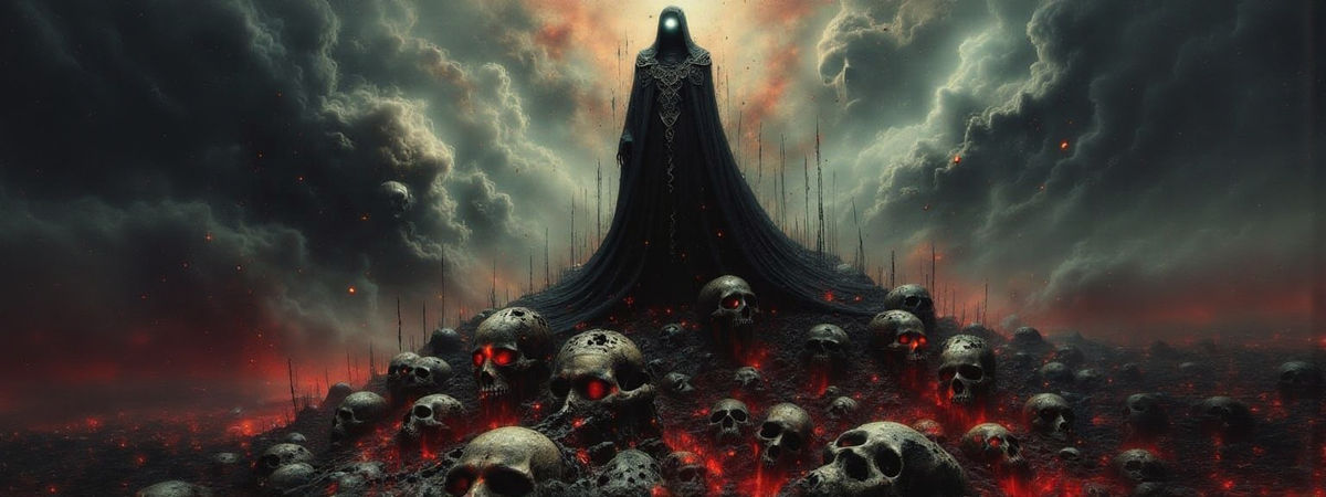 A striking picture of a Viking necromancer warrior standing on a mountain of skulls. This impasto painting features a blood-red sea and swirling nebulas in a dark, surreal style.