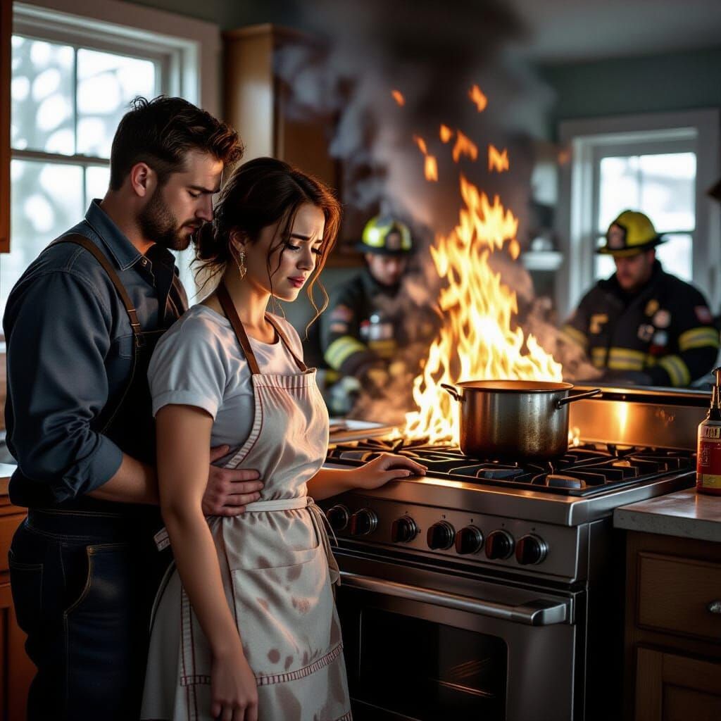 A realistic image captures a wife's distress in a smoke-filled kitchen after a cooking mishap. Firefighters use a hose and extinguisher to combat the blaze while her husband offers comfort.