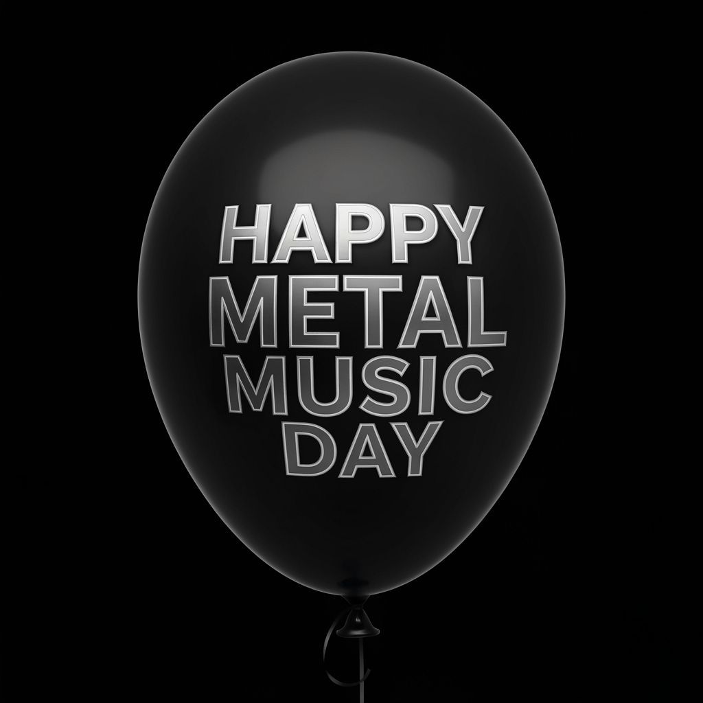 This striking image features a black balloon with bold, metallic lettering celebrating Metal Music Day. It has a dark, edgy aesthetic reminiscent of sci-fi and fantasy art.