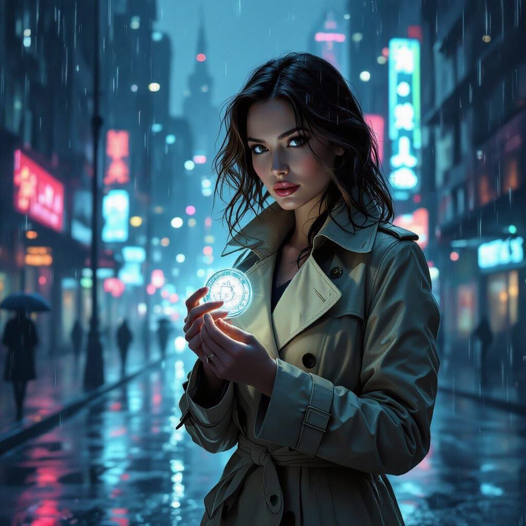 This image shows a solitary Russian woman in a vintage trench coat on a wet, neon street in a futuristic city. She holds a glowing coin, her eyes reflecting determination. The scene uses film noir elements, Art Deco, and cyberpunk styles with cinematic lighting.