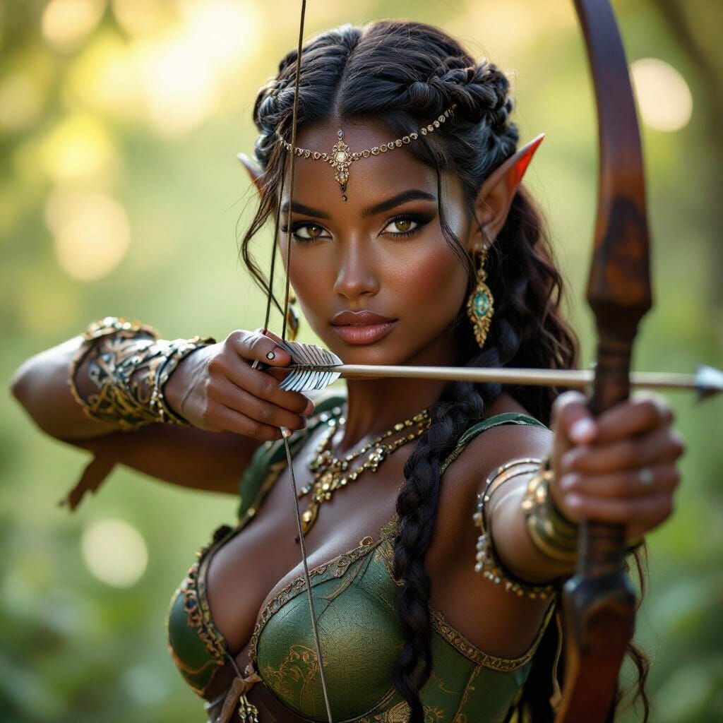 A striking picture of a dark-skinned wood elf goddess. She wears elegant attire and holds a bow in this close-up portrait, which features professional studio lighting and a sharp focus with vibrant colors.