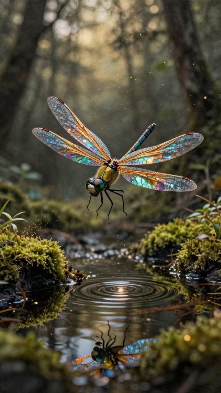 A dragonfly glows above forest ripples and moss. This vivid dragonfly floats above a forest stream, its wings glowing with blue, orange, and purple light. The water ripples below add motion and calm. Surrounded by moss and soft green plants, the scene feels peaceful and alive. Viewers sense the quiet, see the shimmer, and feel the moment. Perfect for nature lovers, fantasy art fans, and golden hour dreamers.