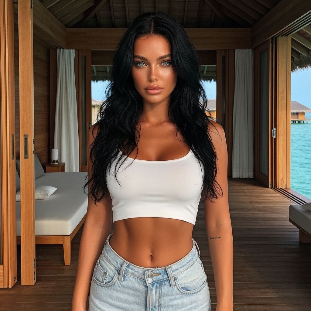 This image shows a beautiful young woman with captivating blue eyes and sun-kissed skin, posing confidently in an elegant overwater villa. Her style is chic and effortless.