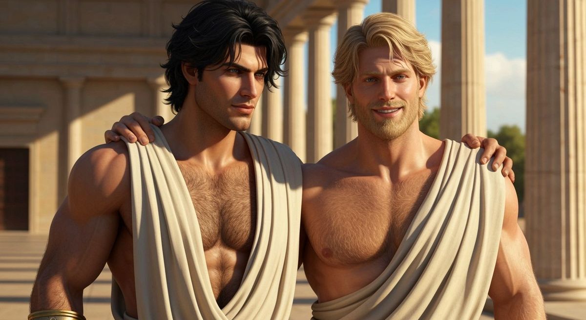 This image depicts a hyperrealistic scene of a youthful Greek god and his friend in a classical courtyard. Soft golden light illuminates their smiles, showcasing a moment of camaraderie in an athletic, muscular style.