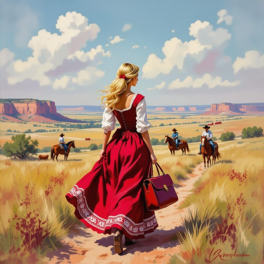 This image shows a blonde woman in a wine-red dress holding a dark red purse, set against a Texas prairie backdrop with cowboys driving cattle. The artwork is rendered with watercolor and gouache effects, using impasto and thick brush strokes.